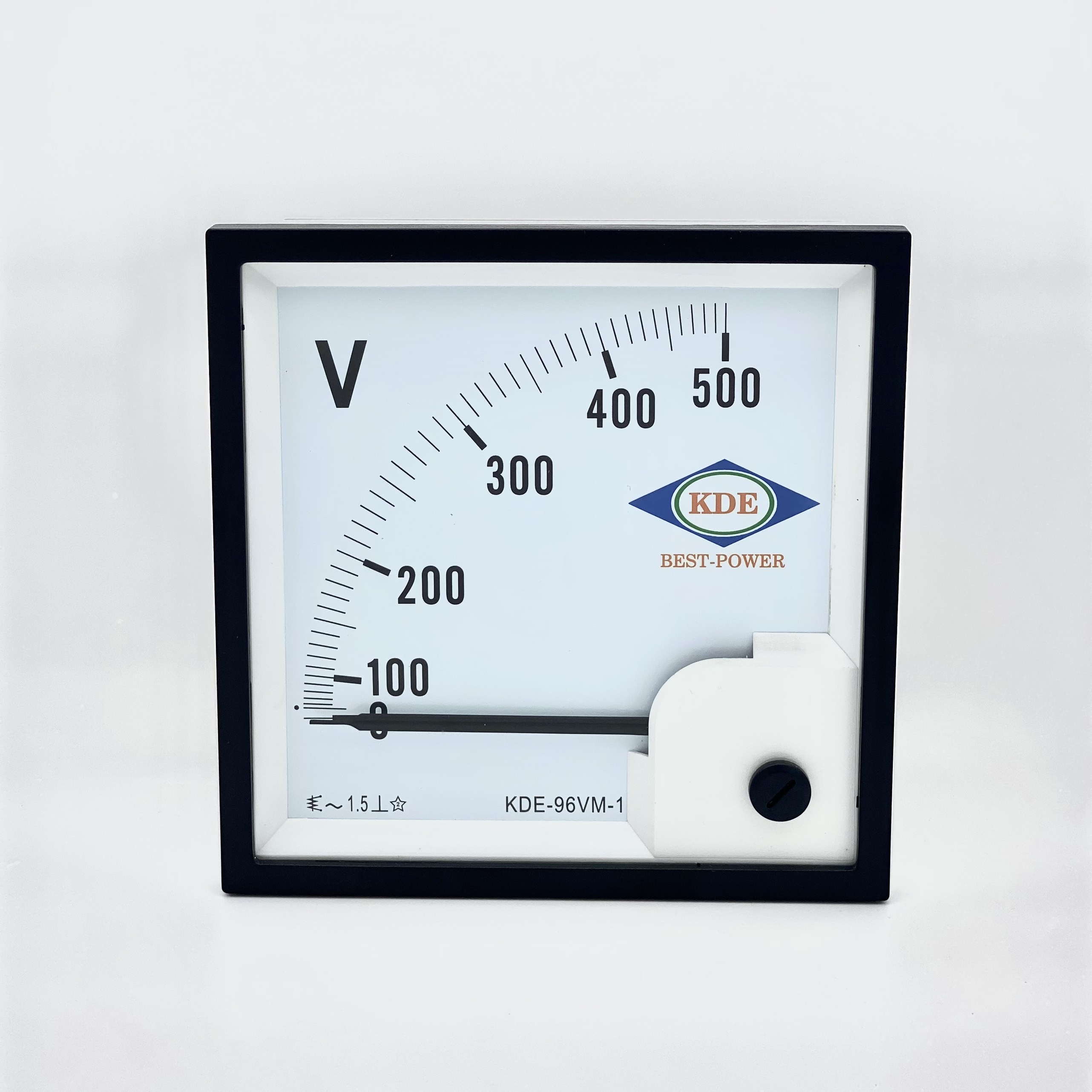 Thông Số Kỹ Thuật: Đồng hồ đo điện áp (Volt) KDE dạng kim 500V AC, kích thước tiêu chuẩn 96x96x68 mm, phù hợp với hầu hết các bảng điều khiển và hệ thống điện.